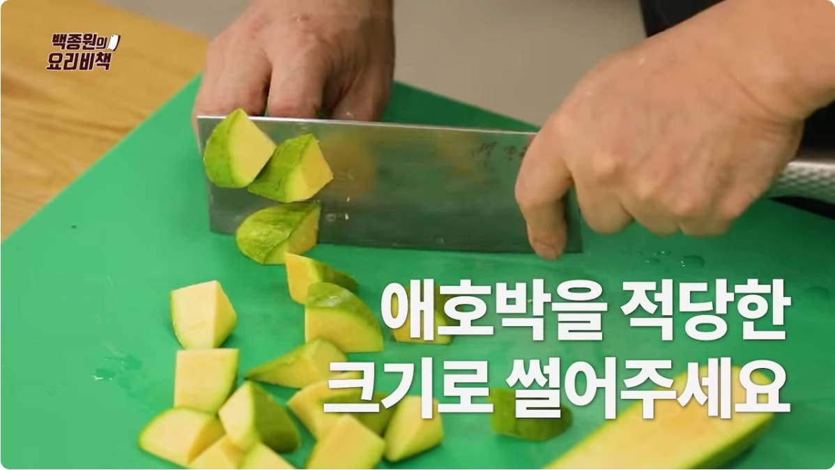 1. 애호박은 길게 반으로 자른 후, 삼각형 모양으로 알맞게 잘라준다.