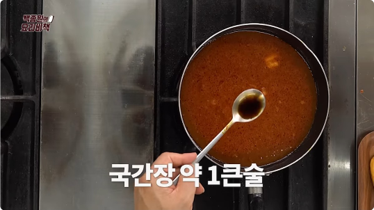 6. 나머지 물을 다 넣고 국간장 1큰술, 꽃소금 반 큰 술을 넣어 강불로 끓여준다.