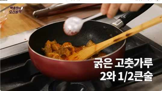 5. 수분이 어느 정도 줄어들면 굵은 고춧가루 2와 1/2큰술을 넣고 볶는다.