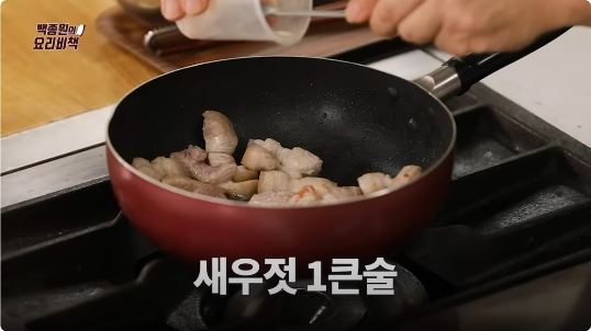 2. 돼지고기가 완전히 익기 전에 약불로 줄이고 새우젓 1큰술을 넣어 함께 볶는다.