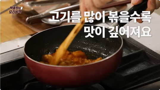 4. 기름이 튀려고 하면 준비된 물의 1/4컵 정도만 넣어 졸이듯이 볶아준다.