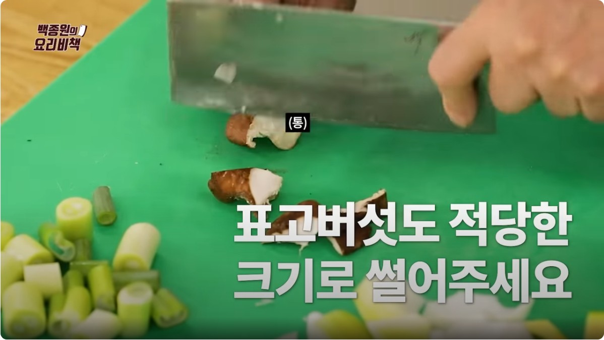 4. 표고버섯은 꼭지를 떼어내고, 알맞은 크기로 잘라 준비한다.