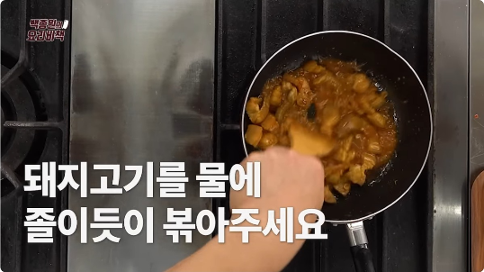 1. 냄비에 식용유 2큰술을 두르고, 돼지고기를 넣어 강불에 볶는다.