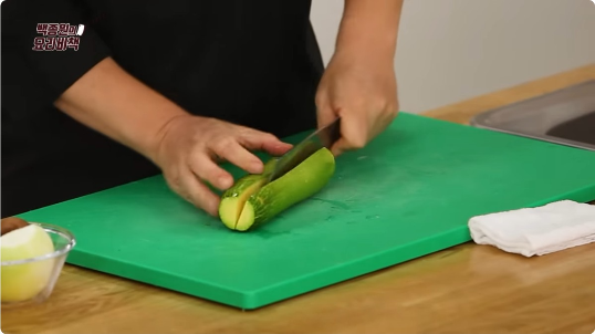 1. 애호박은 길게 반으로 자른 후, 삼각형 모양으로 알맞게 잘라준다.