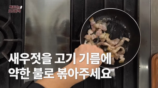 2. 돼지고기가 완전히 익기 전에 약불로 줄이고 새우젓 1큰술을 넣어 함께 볶는다.