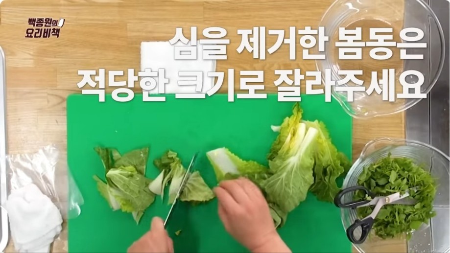 1. 봄동은 심지를 제거하고 반으로 갈라 적당한 크기로 썰어 볼에 담아 준비한다.